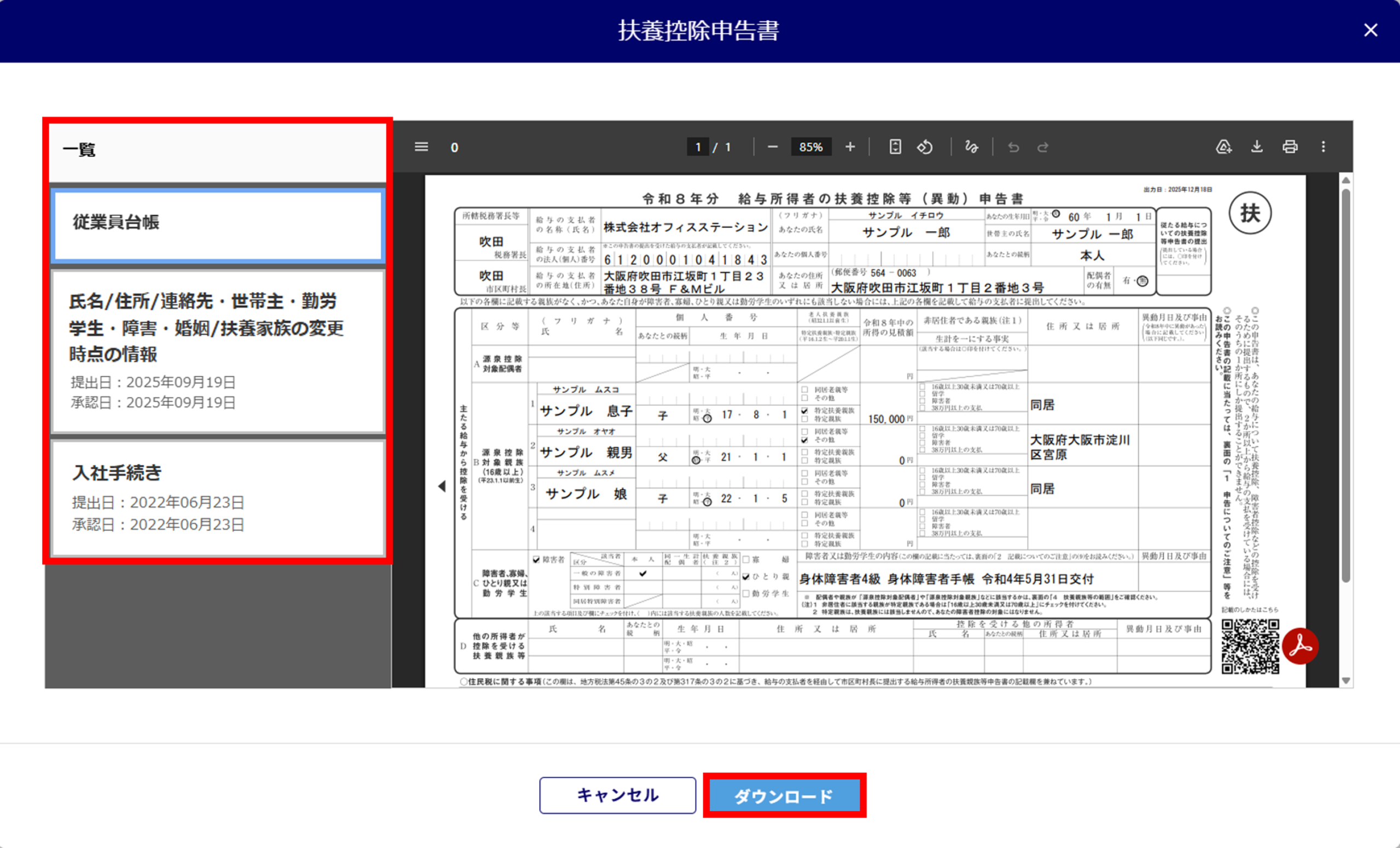 [ダウンロード]をクリックします。扶養控除申告書を作成できる情報は、下表のとおりです。