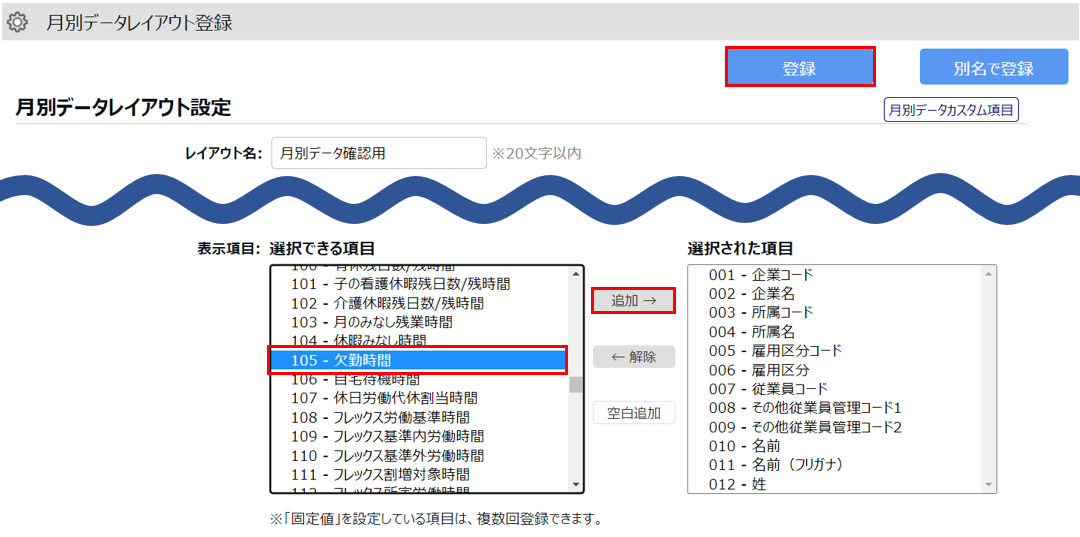 3.出力項目に「◯◯(休暇名)時間(欠勤時間など)」を追加し、[登録]をクリックします。