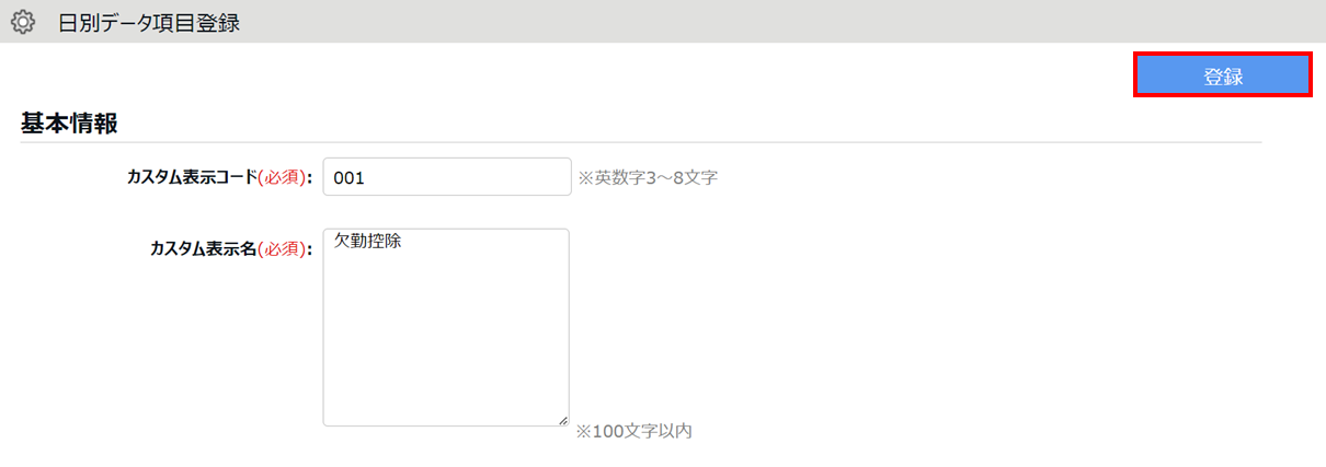2.「カスタム表示コード」、「カスタム表示名」を入力します。