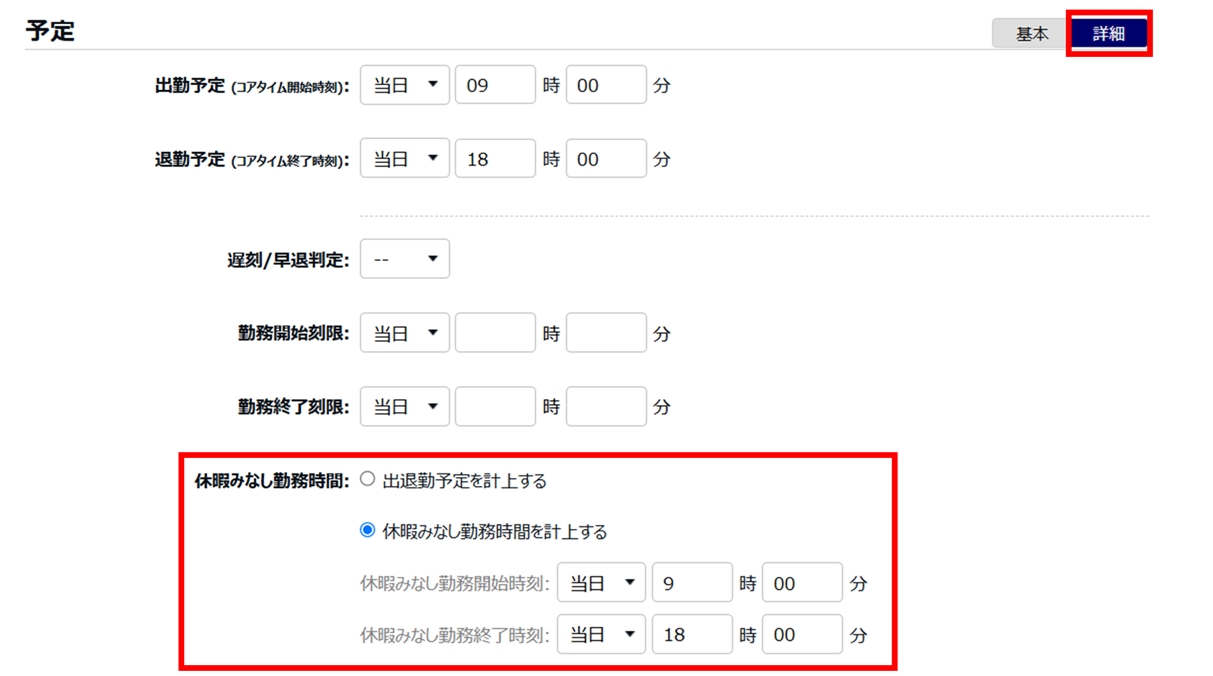 2.「予定」カテゴリの[詳細]を展開し、「休暇みなし勤務時間」を設定します。