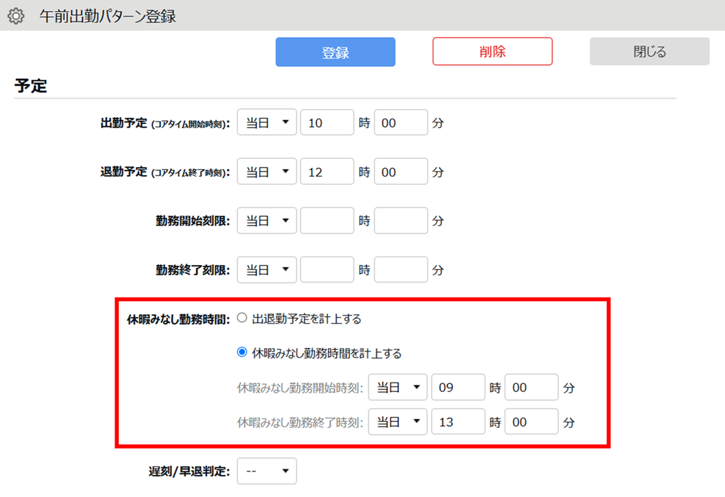 | 休暇みなし勤務時間を計上する | 出退勤予定時刻とは別の時間帯を、休暇みなし勤務時間として計上します。選択すると、休暇みなし勤務開始/終了時刻の入力欄が表示されます。 フレックス勤務などで、出退勤予定時刻(コアタイム)が休暇みなし勤務時間と一致しない場合はこちらを使用します。 |