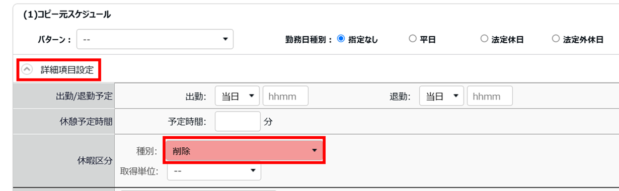 3.「(1)コピー元スケジュール」の「詳細項目設定」を開き、「休暇区分」項目の「種別」欄で「削除」を選びます。