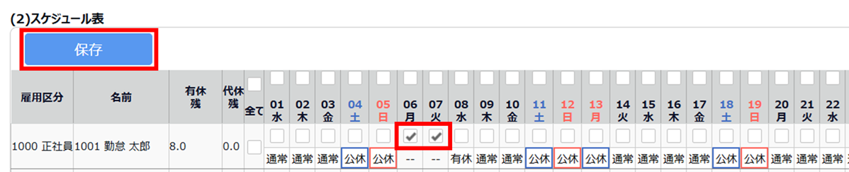 3.「(2)スケジュール表」にて、対象者の取得日にチェックを入れます。