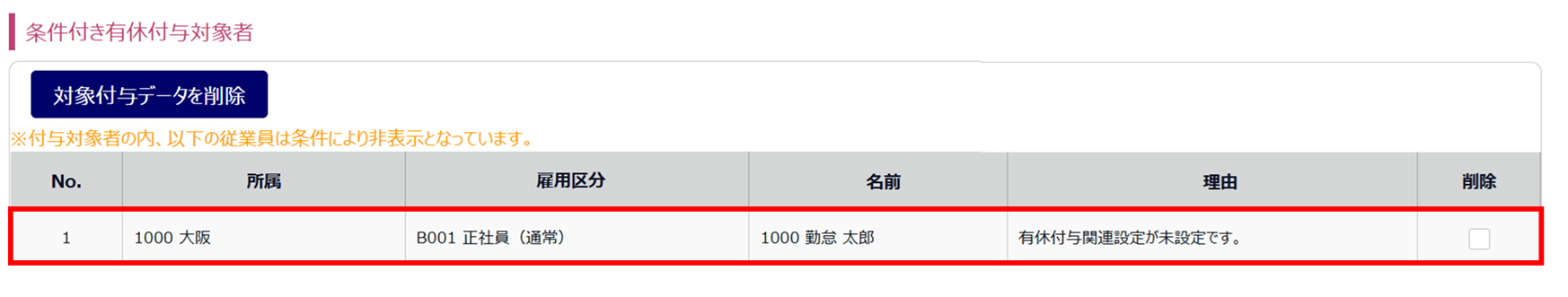 従業員の雇用区分を変更した際に、異動先の雇用区分で有休付与設定がおこなわれていない場合、有休給付与対象から外れた従業員が「条件付き有休付与対象者」として表示されます。