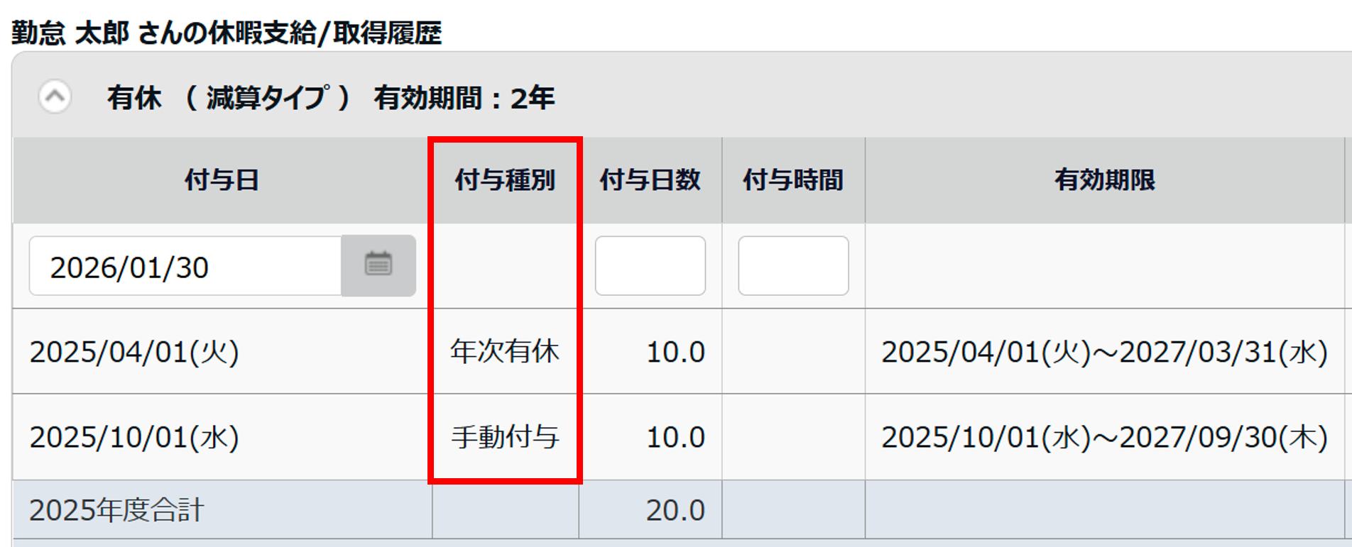 以下の画面で有休の付与履歴を確認できます。付与履歴の「付与種別」欄には付与方法が表示されます。