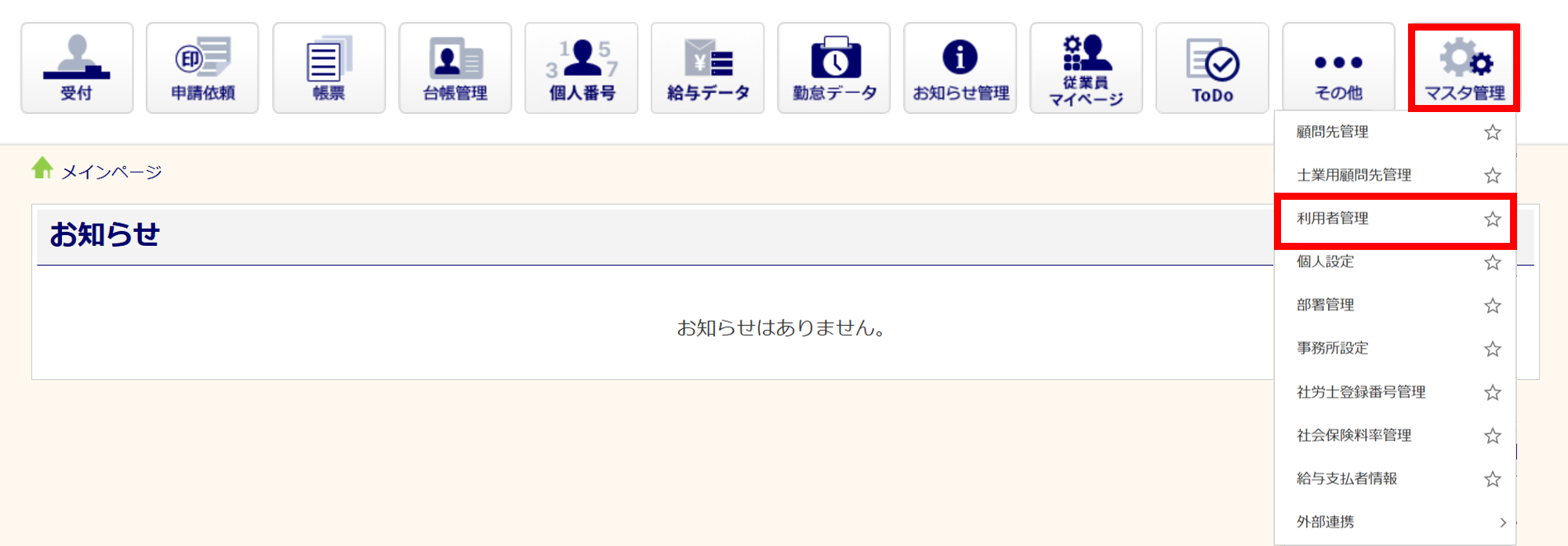 [マスタ管理]>[利用者管理]をクリックします。
