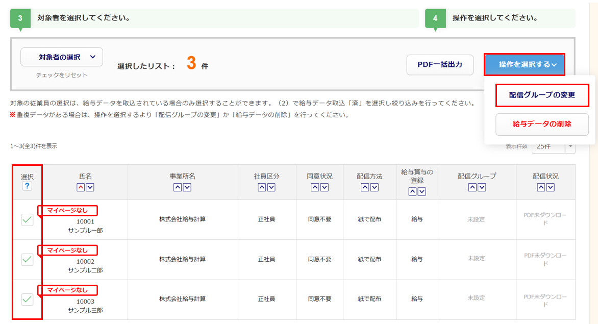 対象従業員の「選択」列をチェックし、[操作を選択する]>[配信グループの変更]をクリックします。