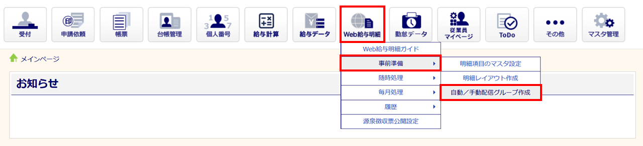 [Web給与明細]>[事前準備]>[自動/手動配信グループ作成]をクリックします。