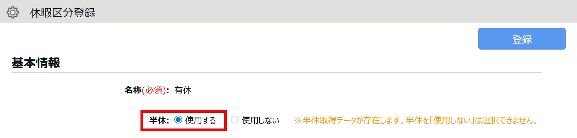 ホーム画面「設定」内[スケジュール]>[休暇区分設定]>該当する休暇区分の[編集]をクリックし、 「半休」を「使用する」に設定します。