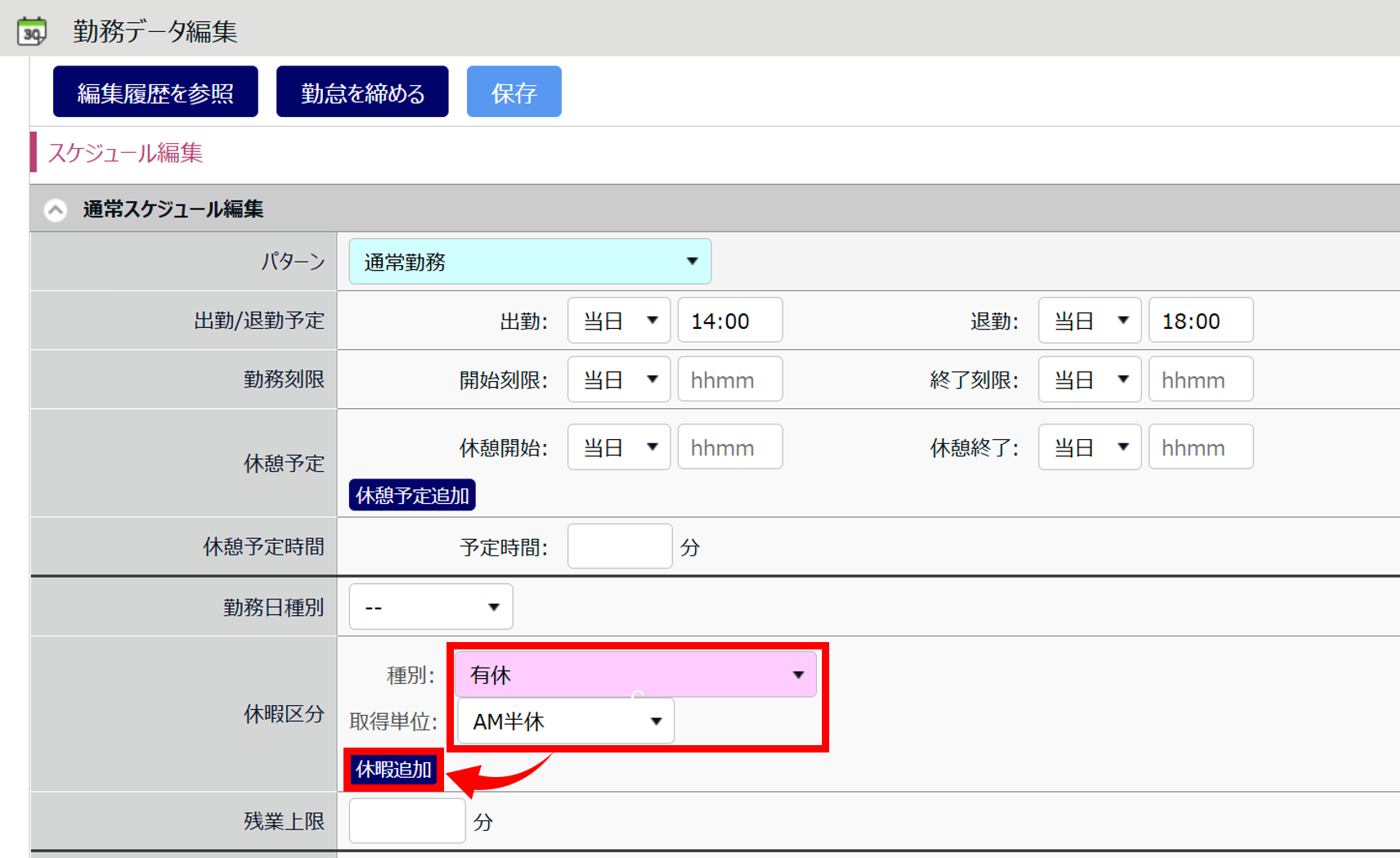 1.対象日に対し、1つ目の休暇区分に「AM半休」を設定後、[休暇追加]をクリックします。