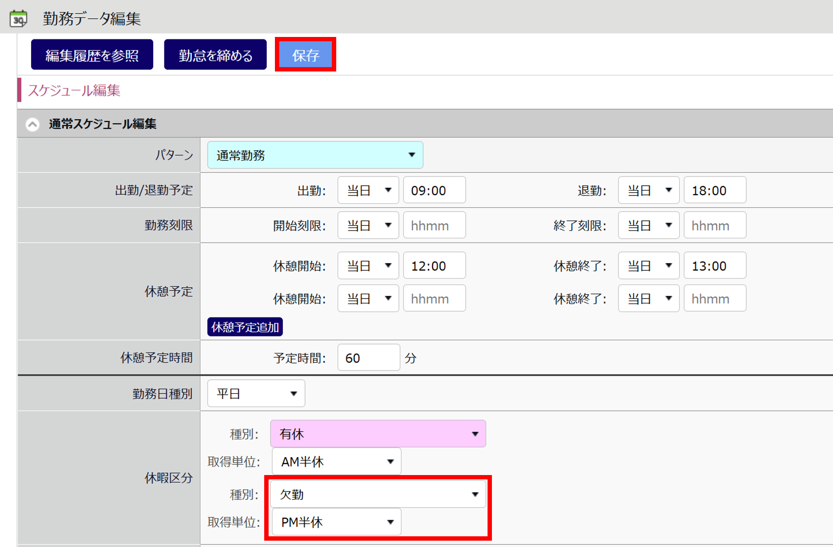 該当日の午前と午後に、それぞれ休暇区分を登録します。