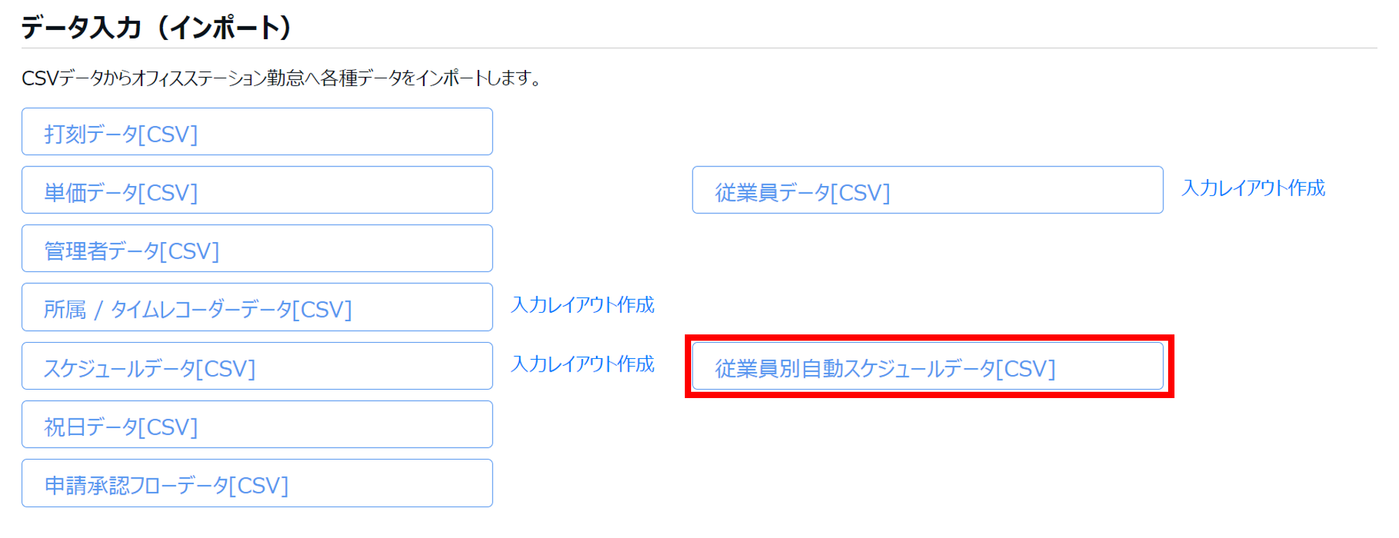 データ入力(インポート)カテゴリ内の[従業員別自動スケジュールデータ[CSV]]をクリックします。