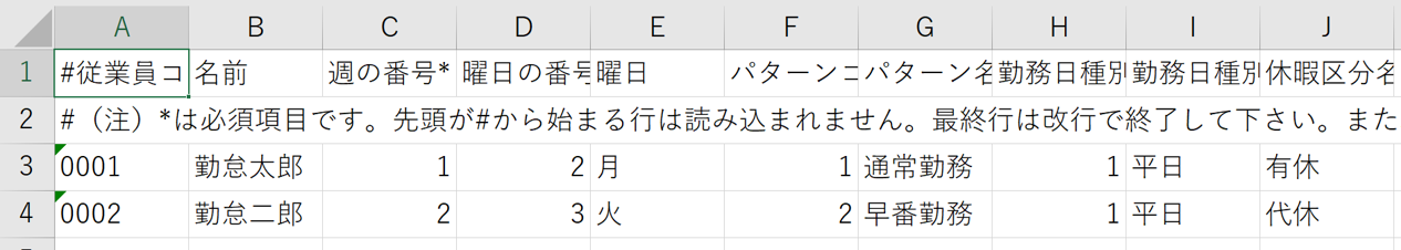 | 勤務日種別名 | 勤務日種別を入力します。未入力でもインポート結果に影響はありません。 ・平日 ・法定休日 ・法定外休日 |