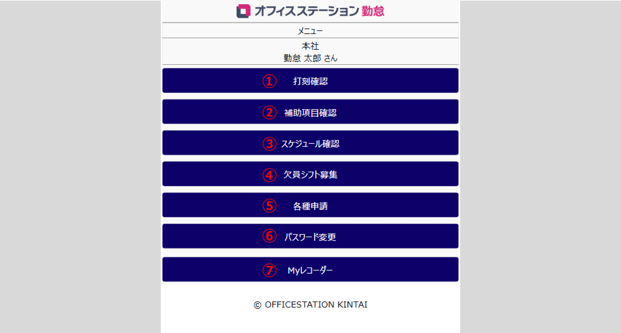 携帯電話やスマートフォンから従業員画面にログインしたとき、またはスマートフォンアプリから「マイメニュー」に遷移したときの操作メニューをご説明します。