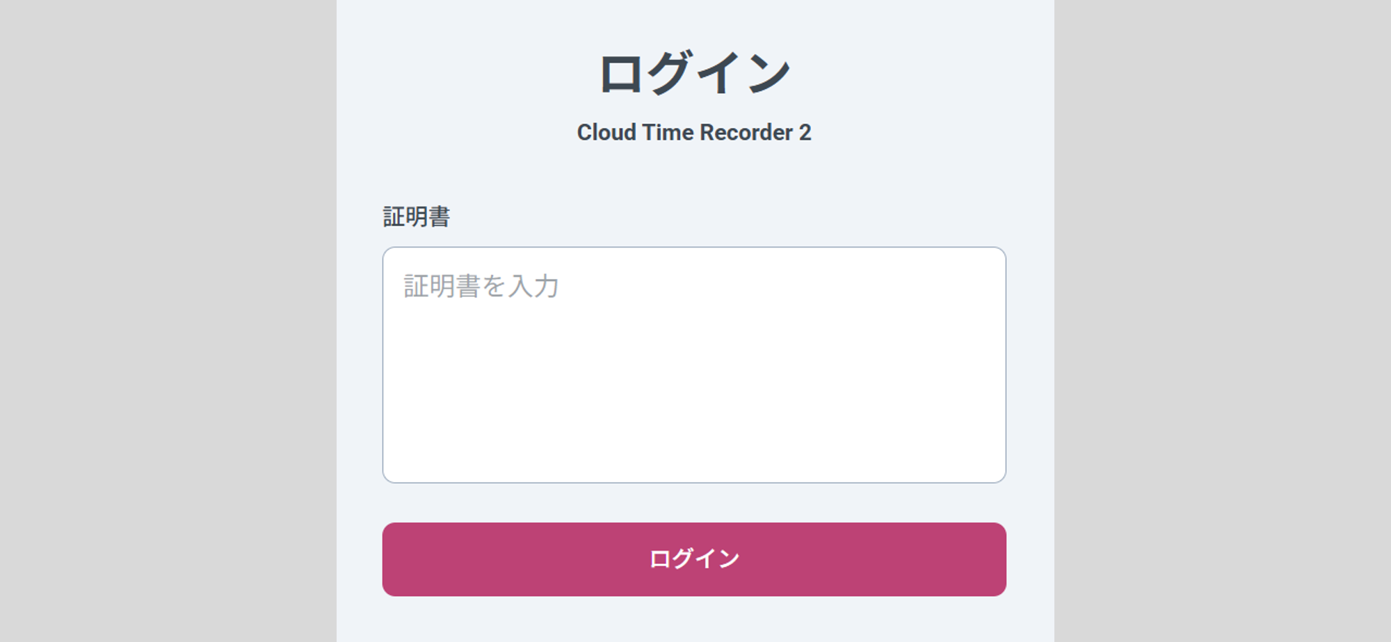 2. [ログアウト]をクリックすると証明書の入力画面に切り替わります。新しい証明書を入力し、[ログイン]をクリックすると、タイムレコーダーを起動できます。