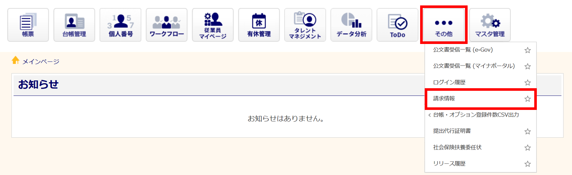 [その他]に[請求情報]が表示されていない場合は、一般権限の利用者の為、確認できません。