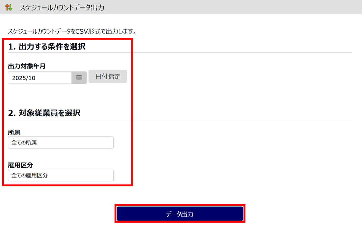 3.出力対象年月、所属、雇用区分を指定し、[データ出力]をクリックします。