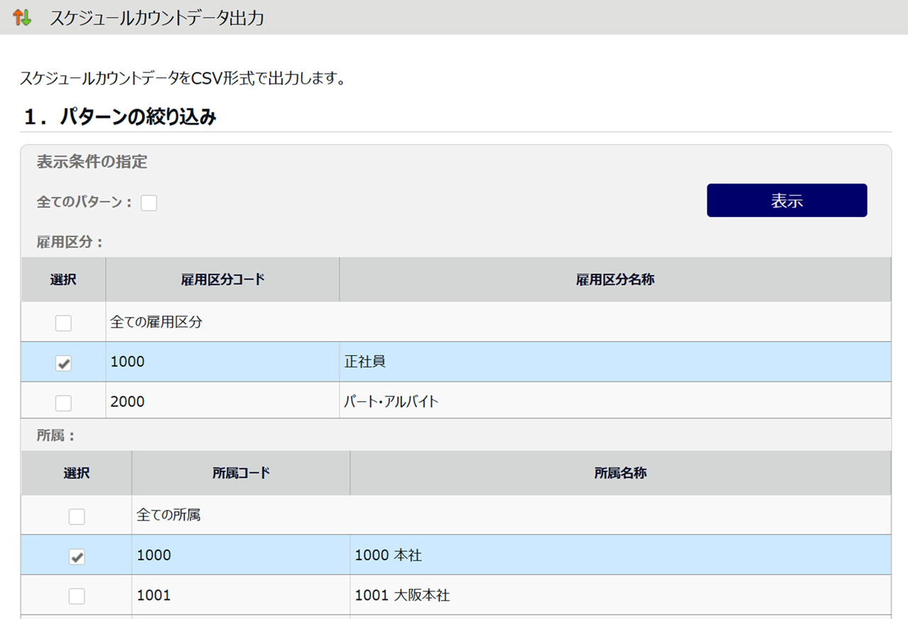 4.カウント対象のパターンの選択画面が表示されます。「1. パターンの絞り込み」では雇用区分と所属を選択し、パターンを絞り込みます。