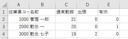 出力したデータは、CSVエディタソフトまたはExcelでご確認いただくと便利です。パターン名の下にその従業員が期間内に使用している回数が記載されています。下図を例に挙げると、勤怠一郎は「通常勤務」パターンを21回使用しているということを表しています。