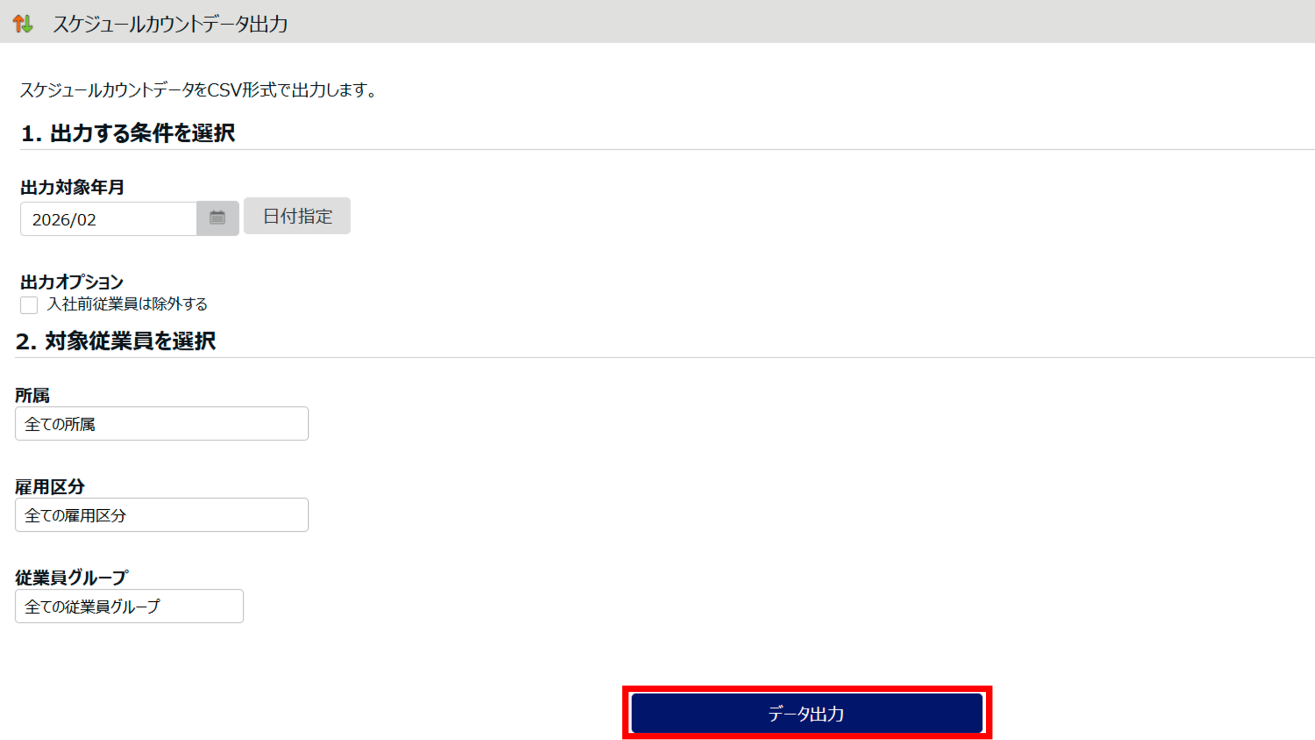 属」「雇用区分」「従業員グループ」を選択し、[データ出力]をクリックします。