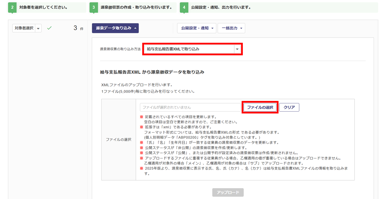 給与支払報告書XMLで取り込み 給与ソフトから出力した「給与支払報告書XML」ファイルを取り込みます。
