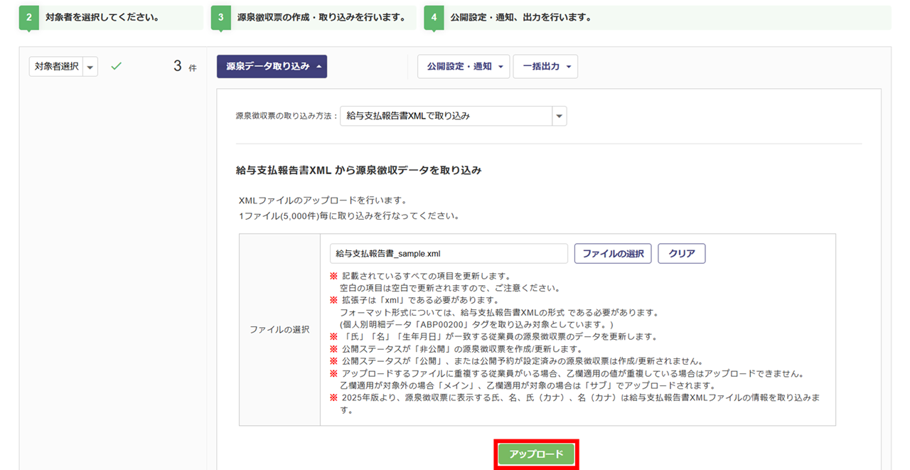 [アップロード]をクリックします。取り込みが正常に終了したら、本マニュアル内「源泉徴収票の公開」にお進みください。