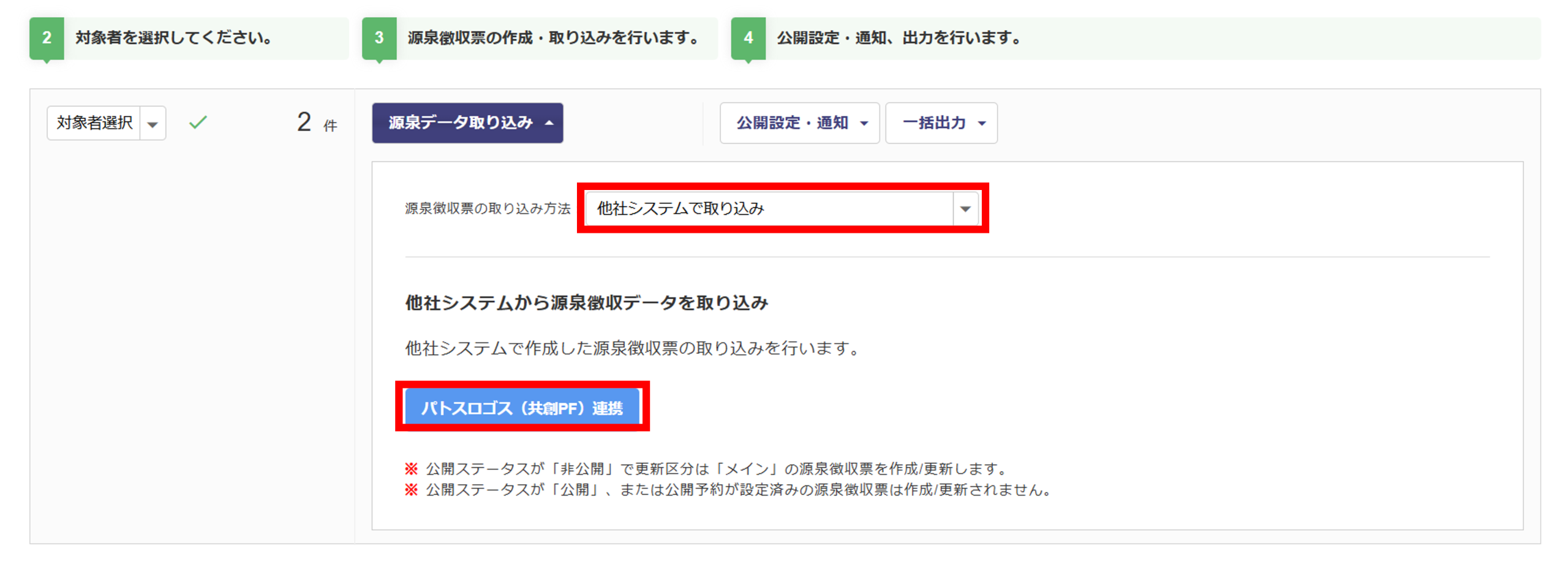 取り込みをご希望の場合には、公開ステータスを「非公開」に変更してから操作してください。