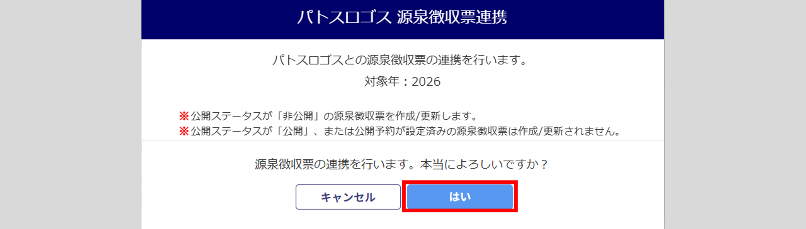 「公開予約日時」に源泉徴収票を従業員マイページに公開する予約日時を入力し、[はい]をクリックします。
