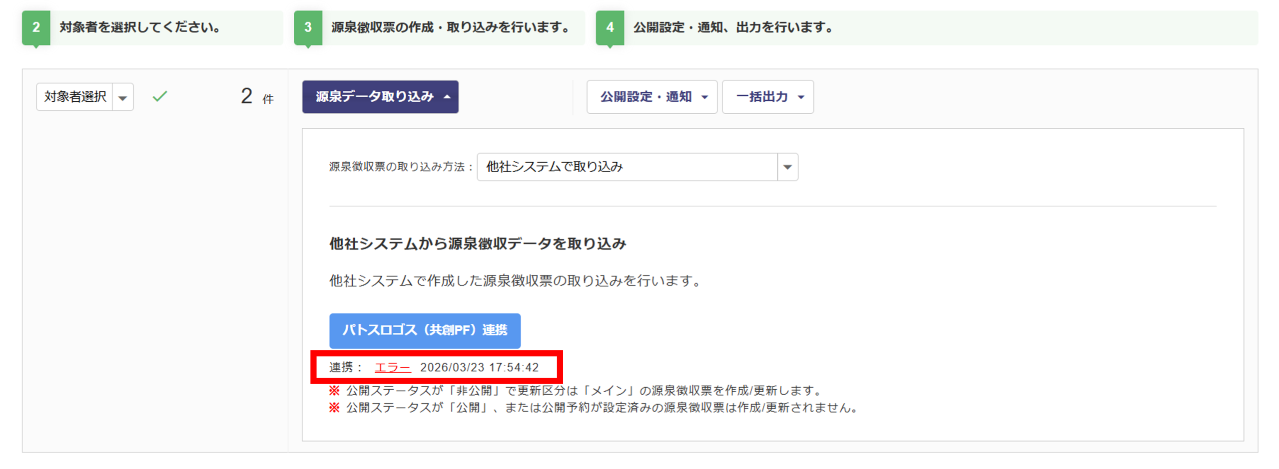 連携結果は、連携ボタンの下に表示します。取り込みが正常に終了したら、本マニュアル内「源泉徴収票の公開」にお進みください。