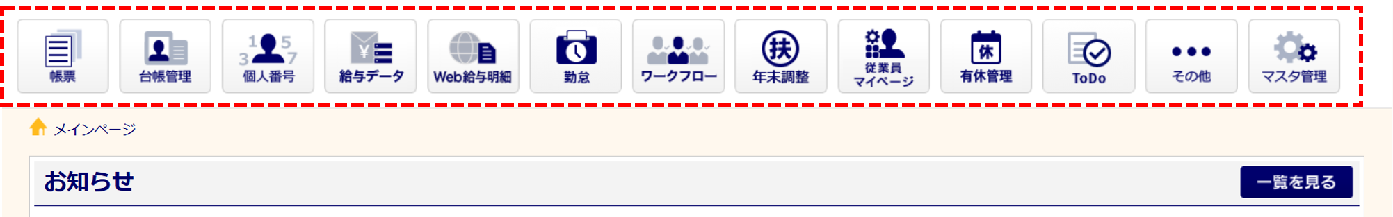 ※「帳票」「個人番号」「Web給与明細」「年末調整」「有休管理」などお申し込みサービスによって表示されるメニュ