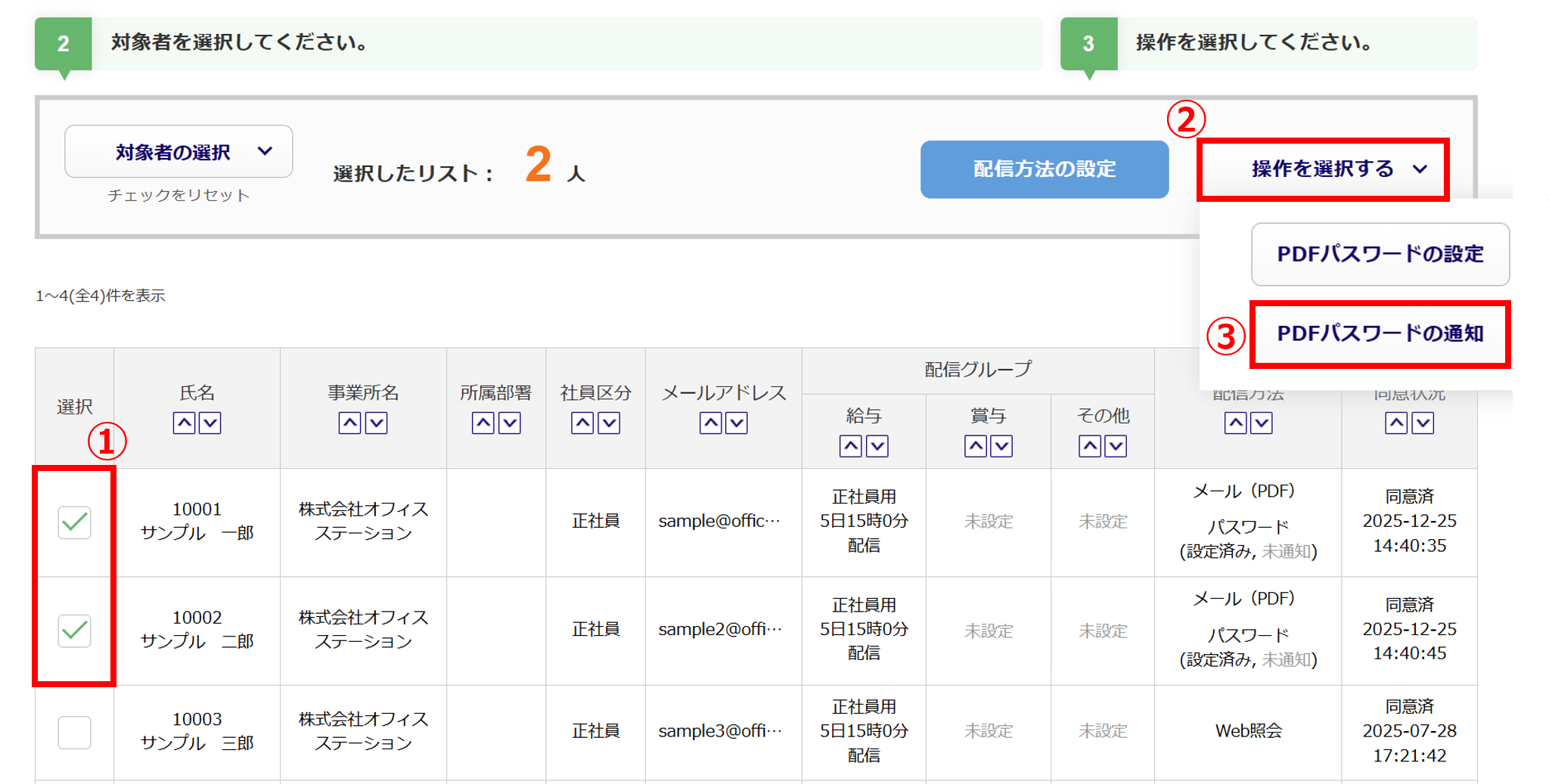 パスワードを再通知したい従業員の「選択」列(①)にチェックをつけ、[操作を選択する](②)>[PDFパスワードの通知](③)をクリックします。