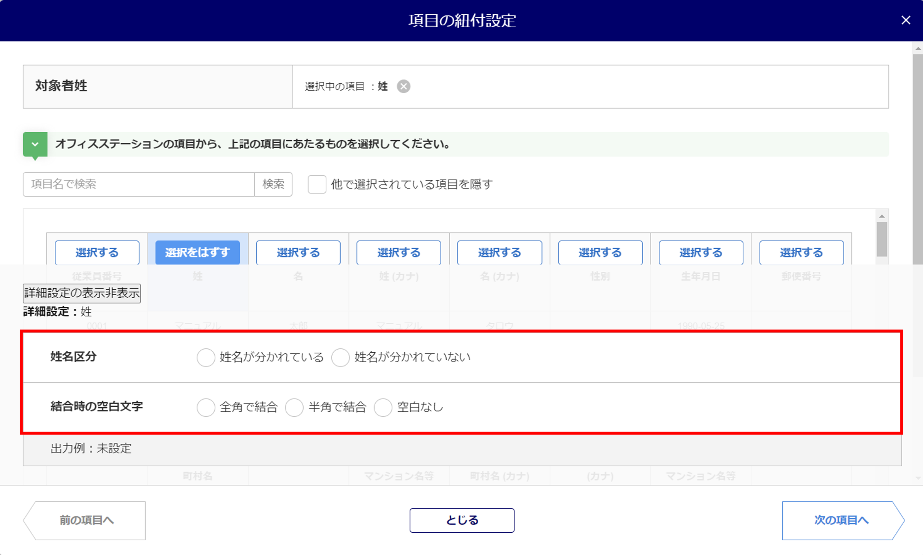 氏名関連 姓名の「結合」「分割」が設定できます。