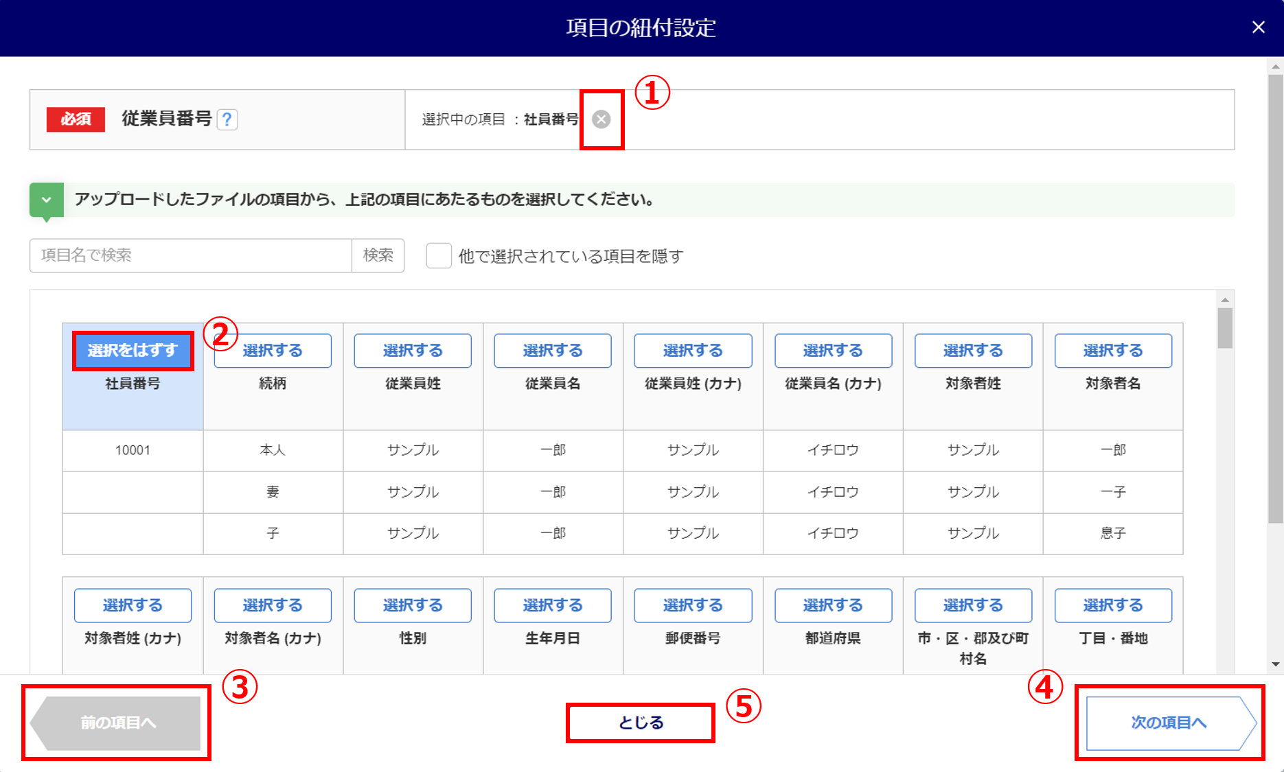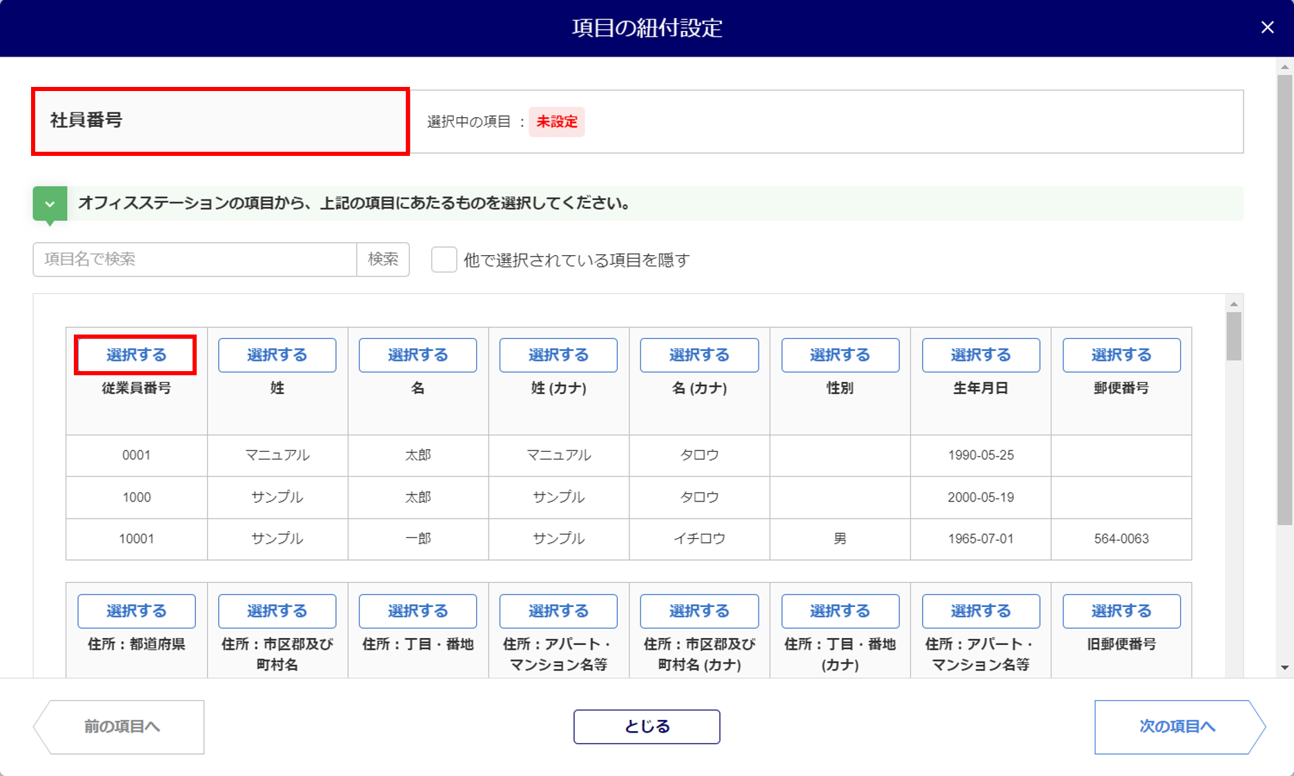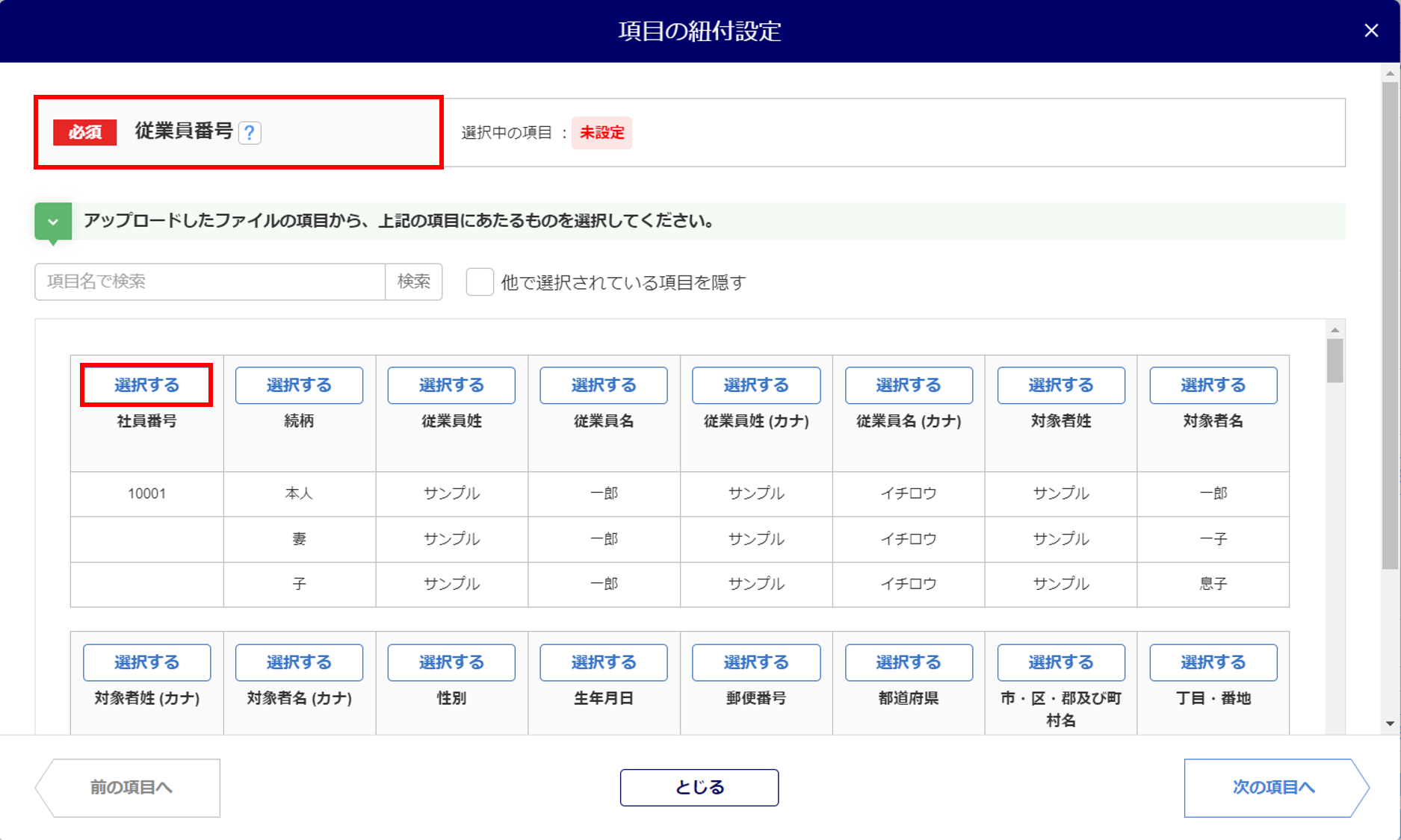 この他の項目についても、「従業員本人」の情報にあたる項目と紐付けます。