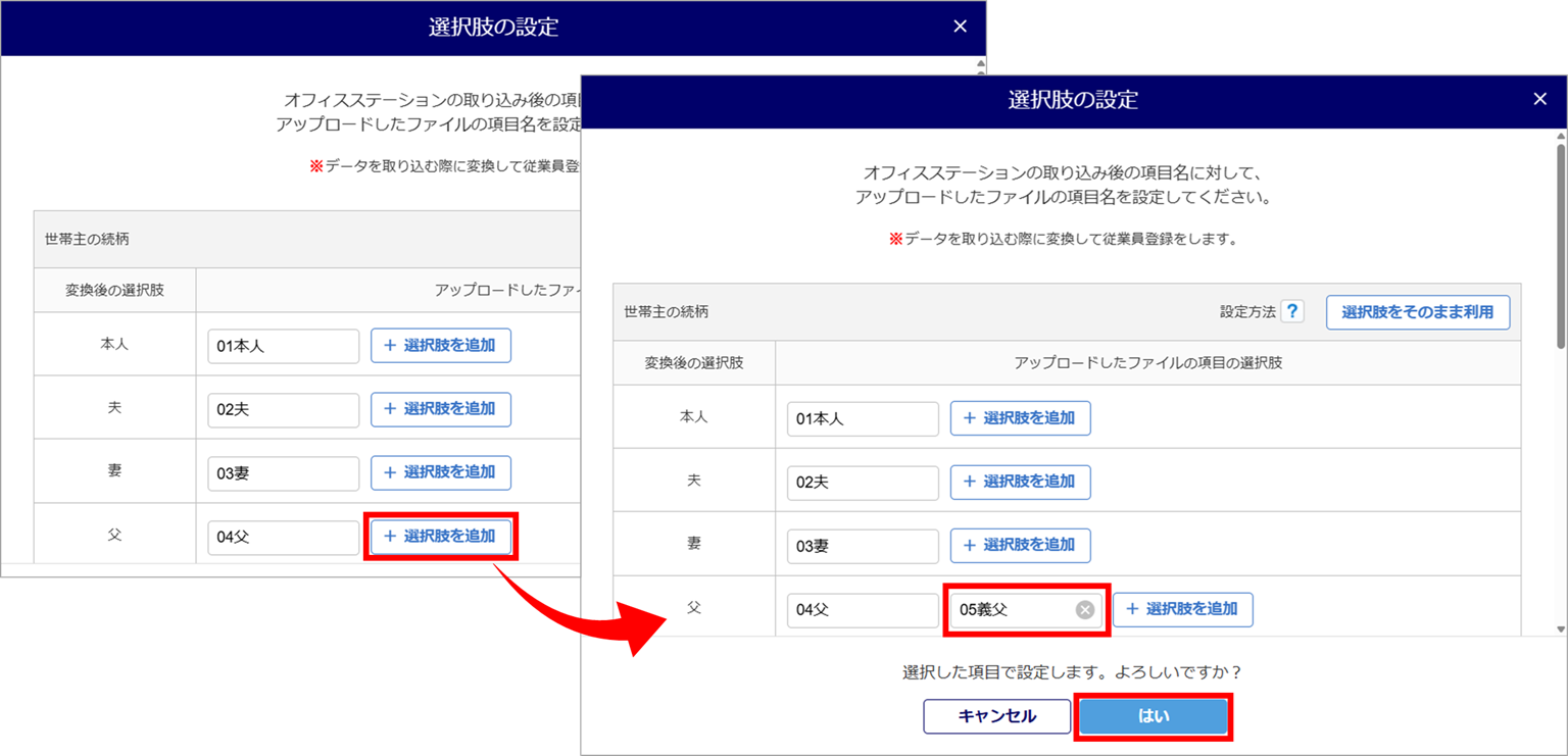 夫を「02夫」と表記しているのであれば「夫」と「02夫」のように、該当する選択肢同士で紐付けます。