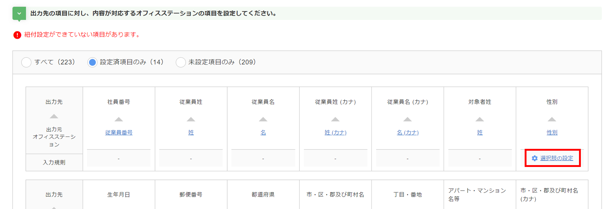 出力するファイルの項目に対応する項目がオフィスステーションにない場合は紐付けをすることができません。何らかの項目に紐付けたい場合は、備考などをご活用ください。