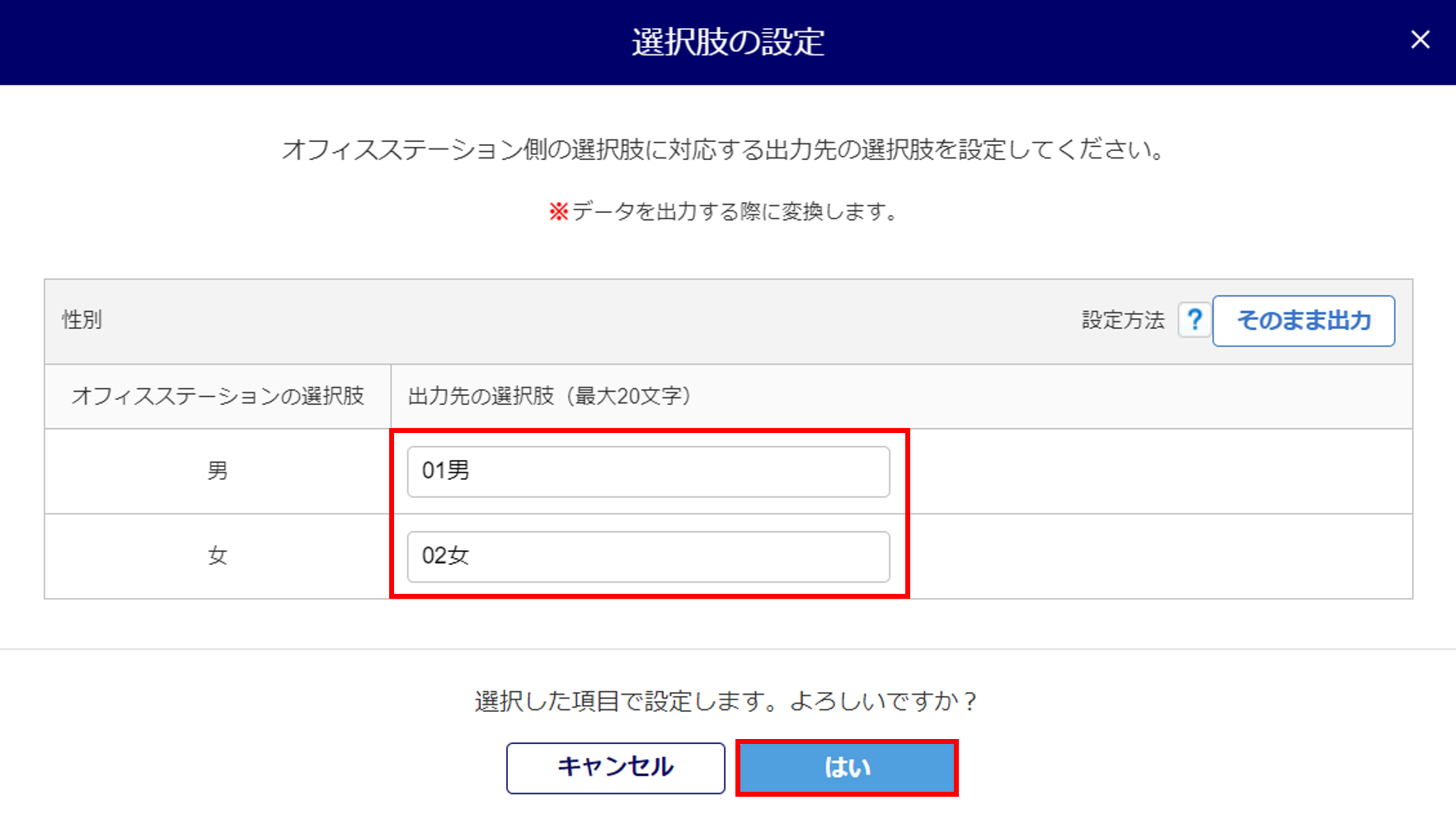 ※[そのまま出力]をクリックすると、オフィスステーションと同じ選択肢名がセットされます。