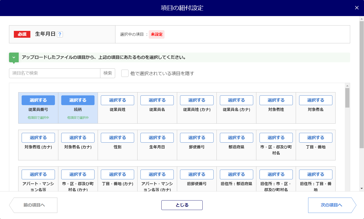 項目は必ず紐付ける必要はありません。その場合は未選択のまま操作を進めてください。
