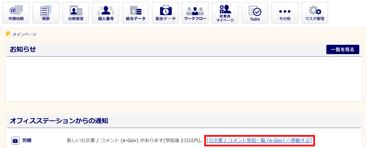 - 「オフィスステーションからの通知」内に「新しい公文書 / コメントがあります。」の表示がある場合