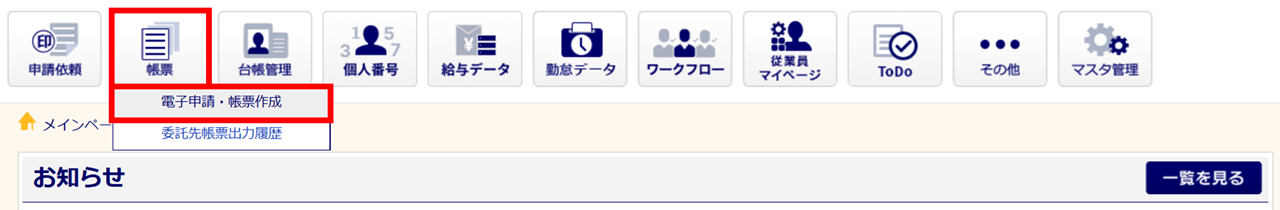[帳票]>[電子申請・帳票作成]をクリックします。「帳票」画面に進みます。