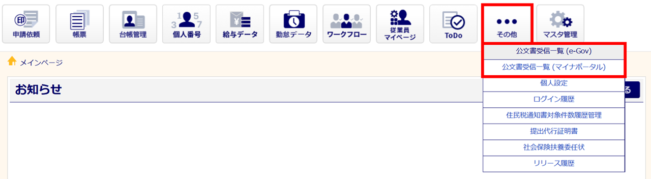 [その他]>[公文書受信一覧(e-Gov)]または[公文書受信一覧(マイナポータル)]をクリックします。
