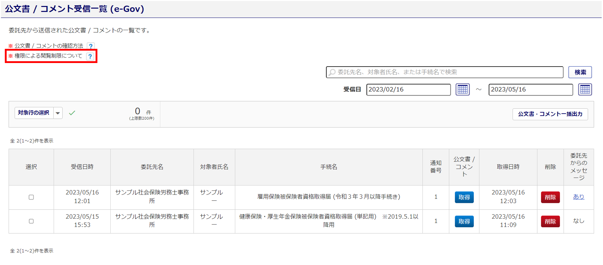 委託先社労士から受信した公文書 / コメントの一覧が表示されます。