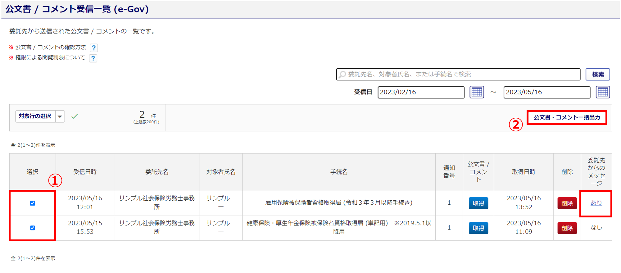 取得する公文書の「選択」列(①)にチェックを付け、[公文書・コメント一括出力](②)をクリックします。