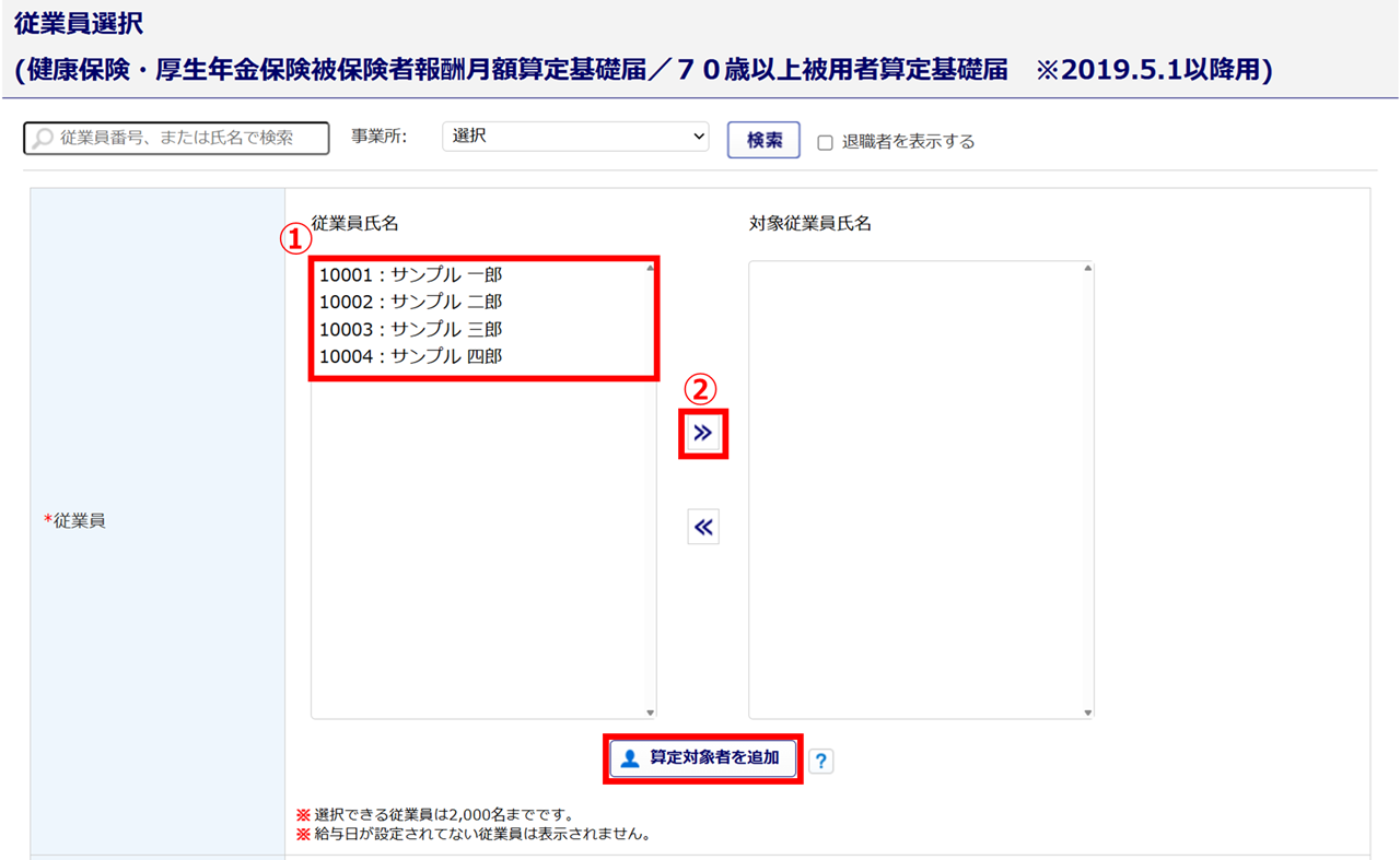 手動で対象者を選択する場合は、対象従業員(①)を選択し、[