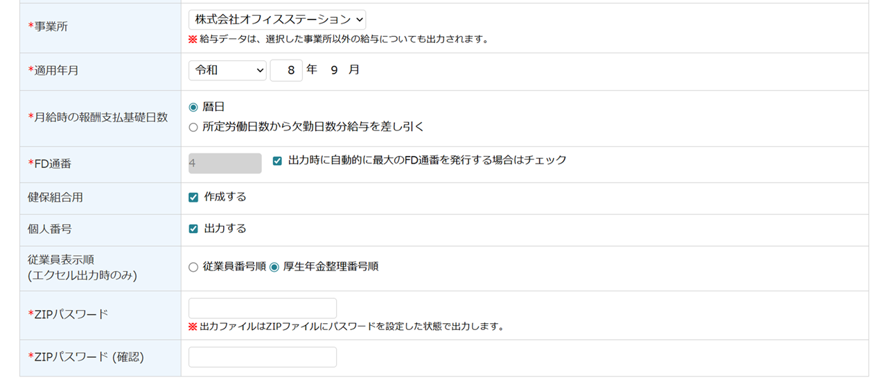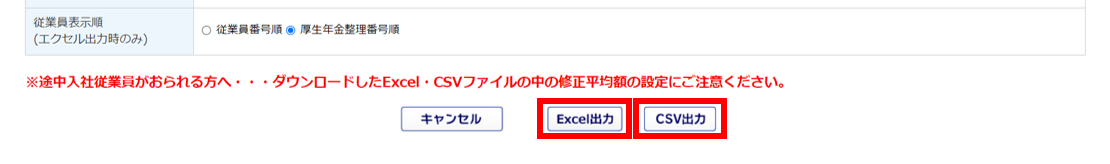| 従業員表示順 | Excelファイルを出力した際の並び順を、「従業員番号順」もしくは「厚生年金整理番号順」から選択します。 ※従業員の表示順の選択は、Excel出力時のみになります。 CSV出力時は「厚生年金整理番号順」固定となります。 |