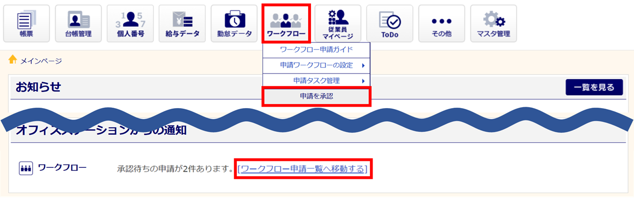 ワークフロー「申請を承認」機能の操作は、顧問先企業側システムでのみおこなえます。