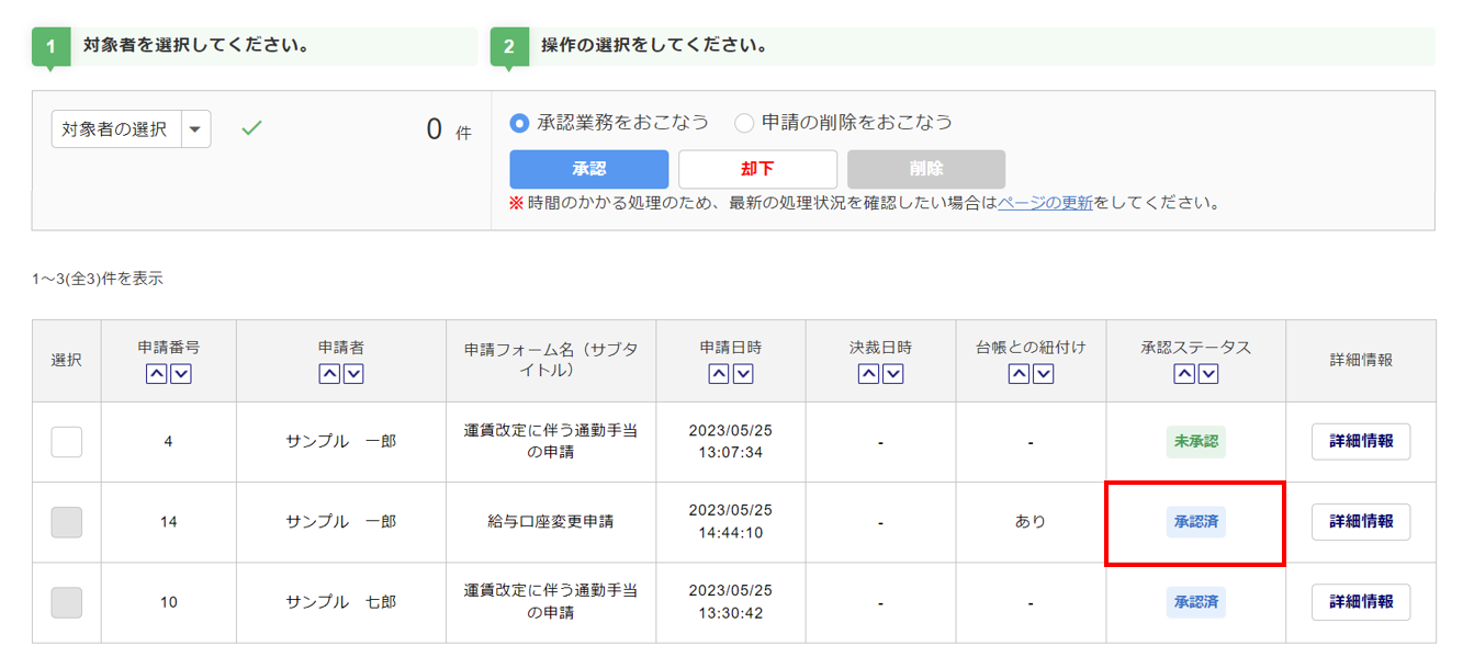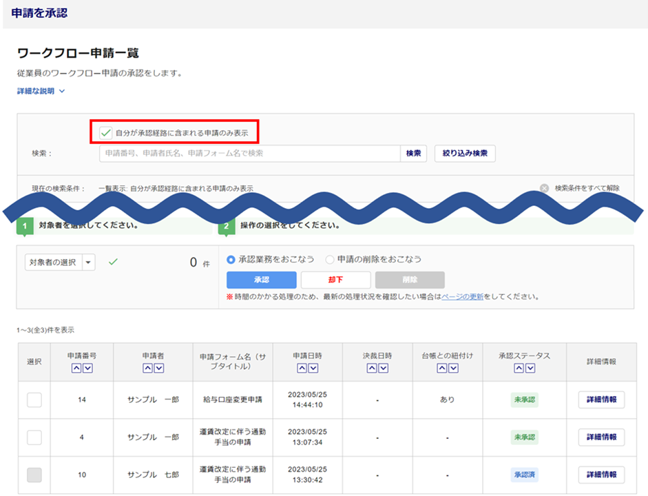 従業員からのワークフロー申請の情報を一括で承認(決裁・確認)または却下をおこないます。