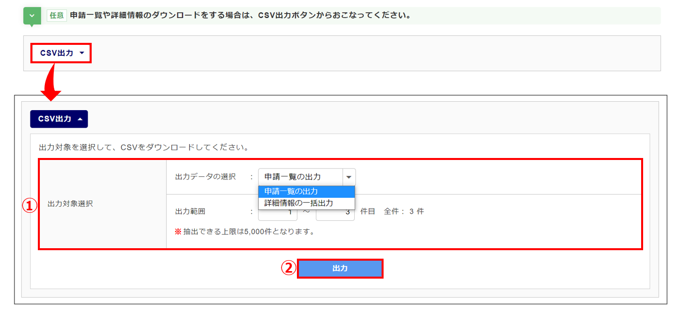 「CSV出力」などで申請の情報を確認後におこなうことを推奨します。