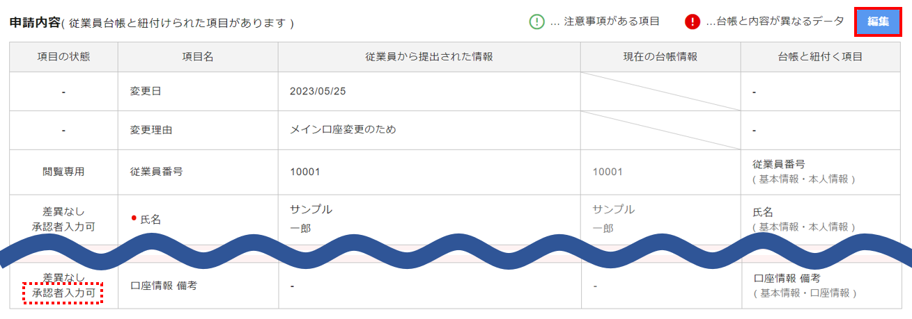 従業員から提出された情報と現在の台帳情報に差異がある場合に表示されます。