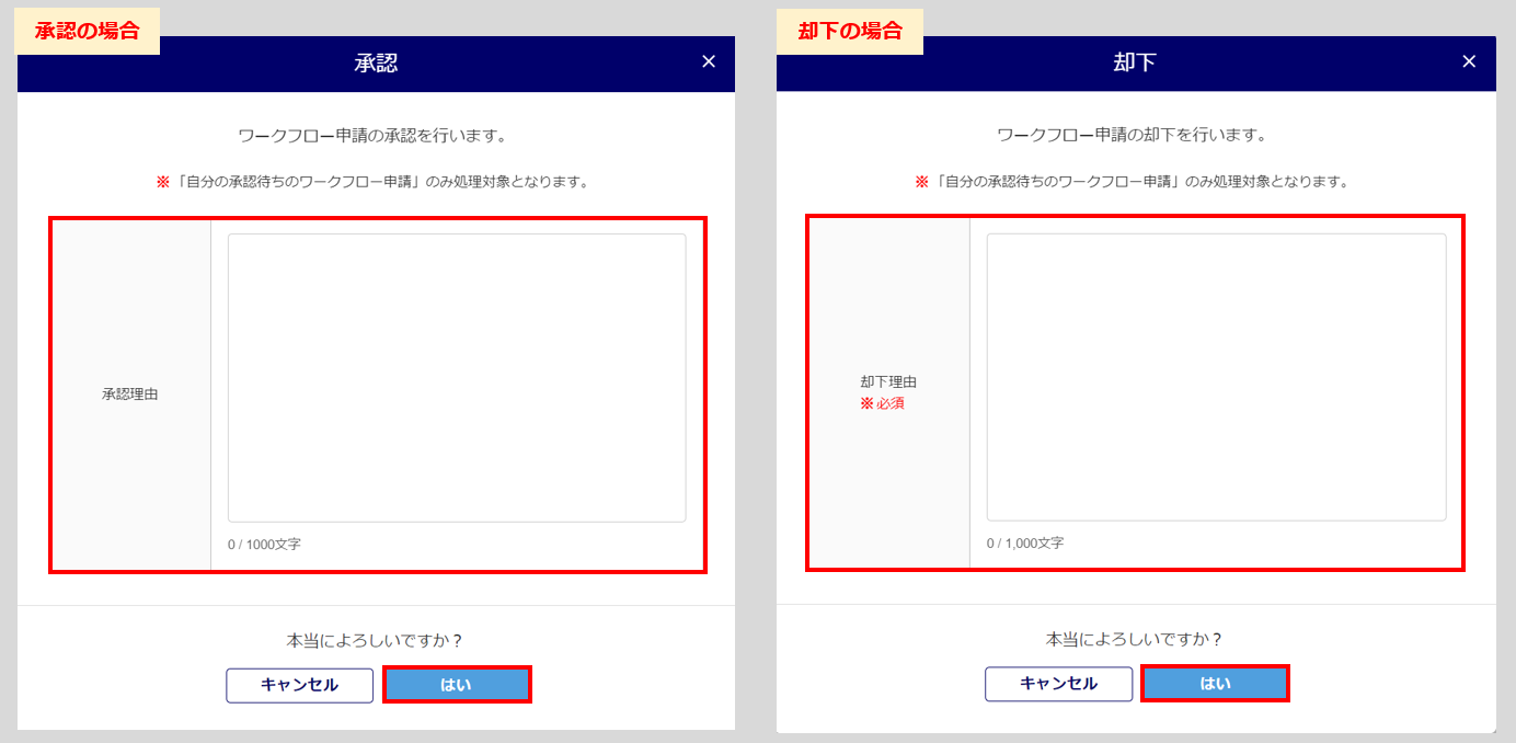 「承認理由(または「却下理由」)」を入力し、[はい]をクリックします。