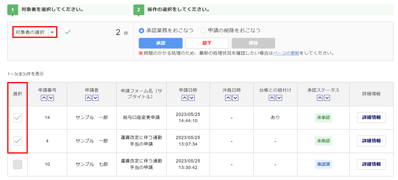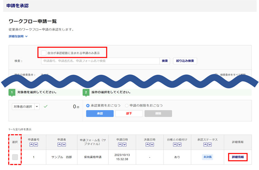承認(または却下)対象の申請の「選択」列をチェックします。
